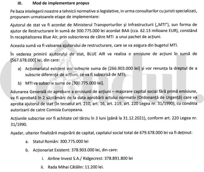 Reprezentanții Blue Air au propus și un ”Mod de implementare” pentru recapitalizarea companiei, ajutorul de stat acordat de Ministerul Transporturilor urmând a fi de 300.775.000 lei.