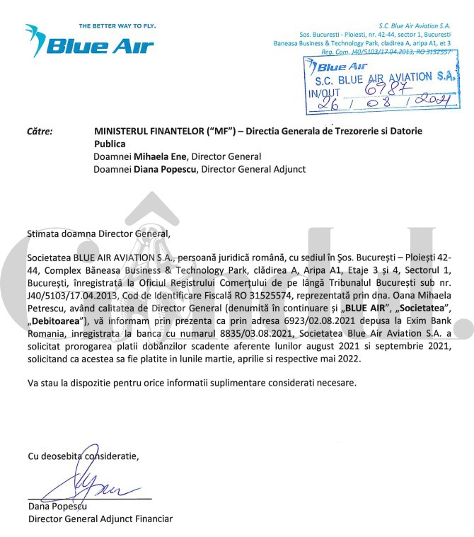 Pe data de 26 august 2021, compania Blue Air a transmis o adresă către Ministerul Finanțelor, anunțând că a solicitat EximBank ca dobânzile scadente, aferente lunilor august 2021 și septembrie 2021, să fie plătite în lunile martie, aprilie și mai 2022.