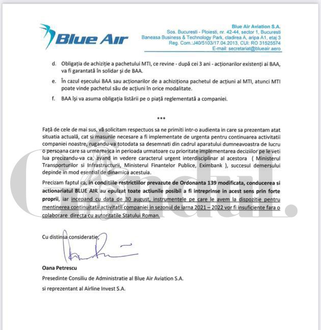 Potrivit documentului respectiv, compania Blue Air l-a anunțat pe Cătălin Drulă că nu mai poate continua activitatea fără ”o infuzie rapidă de fonduri de minim 54 milioane de euro”.