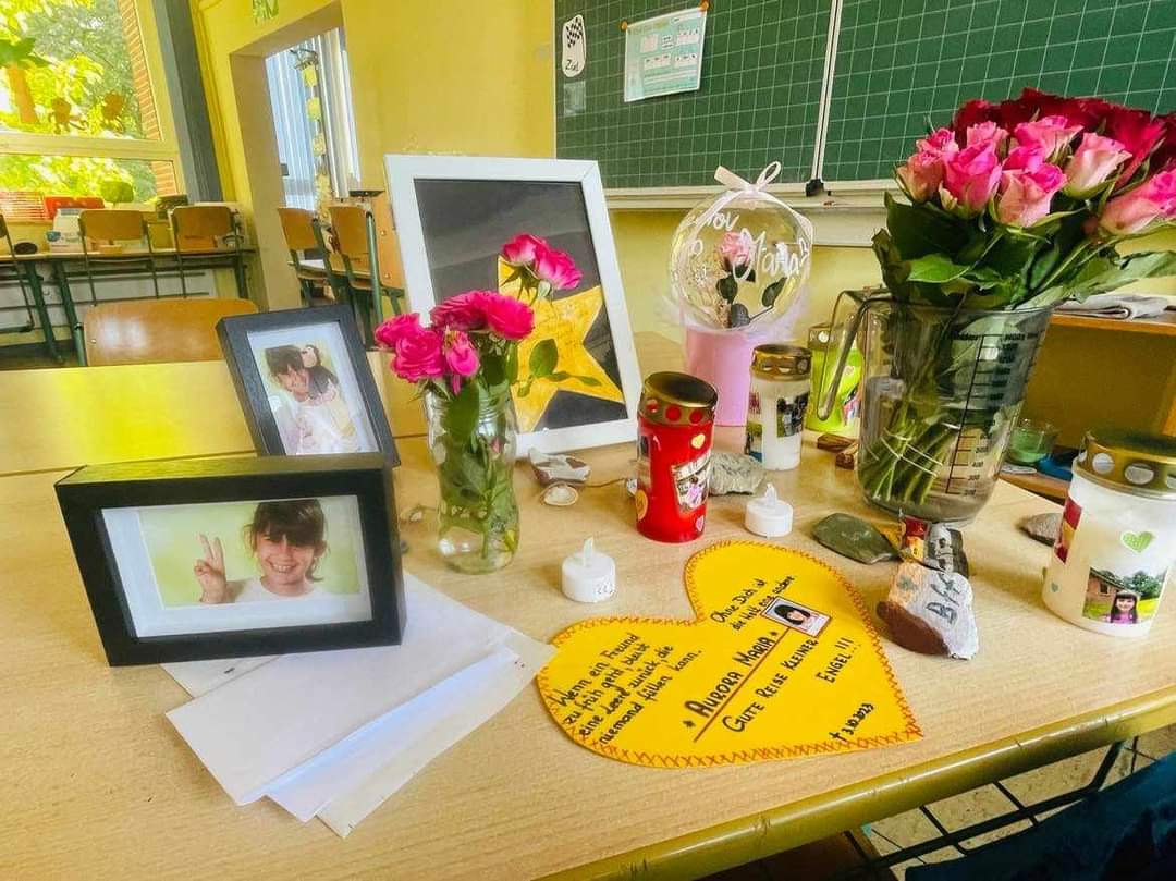Pe băncile unde au învățat colegele lor românce, elevii germani au pus fotografii cu ele, buchete de trandafiri roz, lumânări, inimioare și aripi de înger, realizate chiar de ei, din hârtie, pe care au scris mesaje.