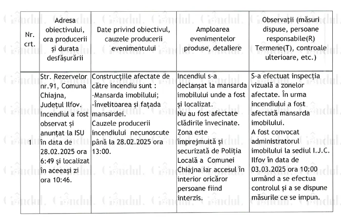 Potrivit informațiilor obținute, în exclusivitate, de Gândul, în raportul înaintat către Victorița Dumitrașcu, inspector general ISC, echipa de control care s-a deplasat la fața locului a menționat că „incendiul a fost observat şi anunţat la ISU în data de 28.02.2025, ora 6:49, şi localizat în aceeaşi zi, la ora 10:46.”