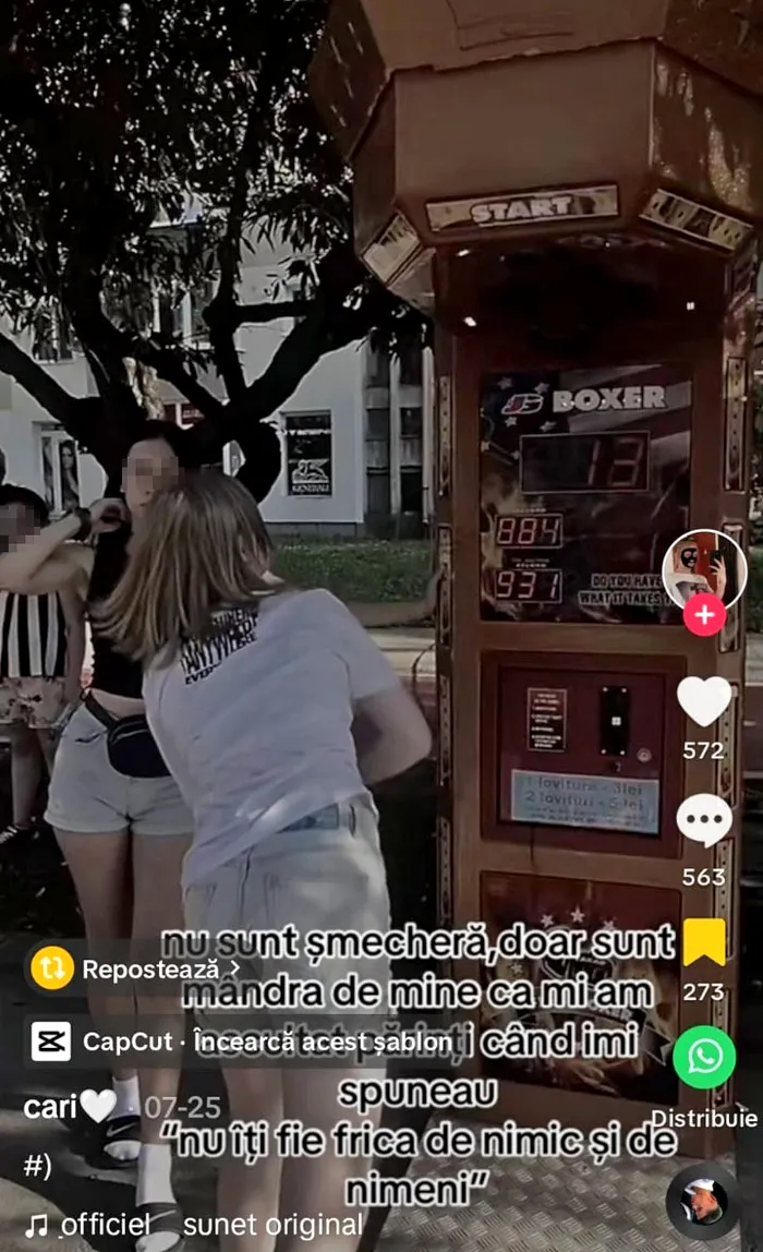 ”Nu sunt șmecheră, dar sunt mândră de mine că mi-am ascultat părinții când îmi spuneau «nu-ți fie frică de nimic și de nimeni»”, este mesajul care însoțește filmulețul în care agresoarea lovește cu forță în Boxing Machine.
