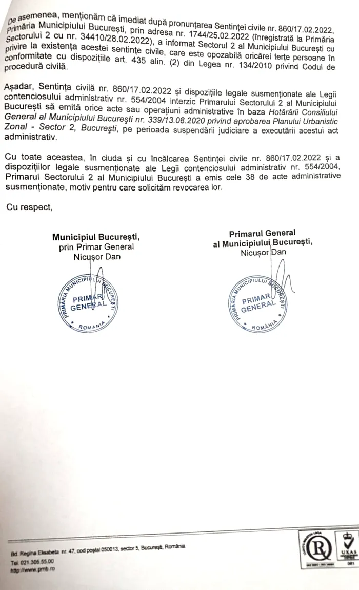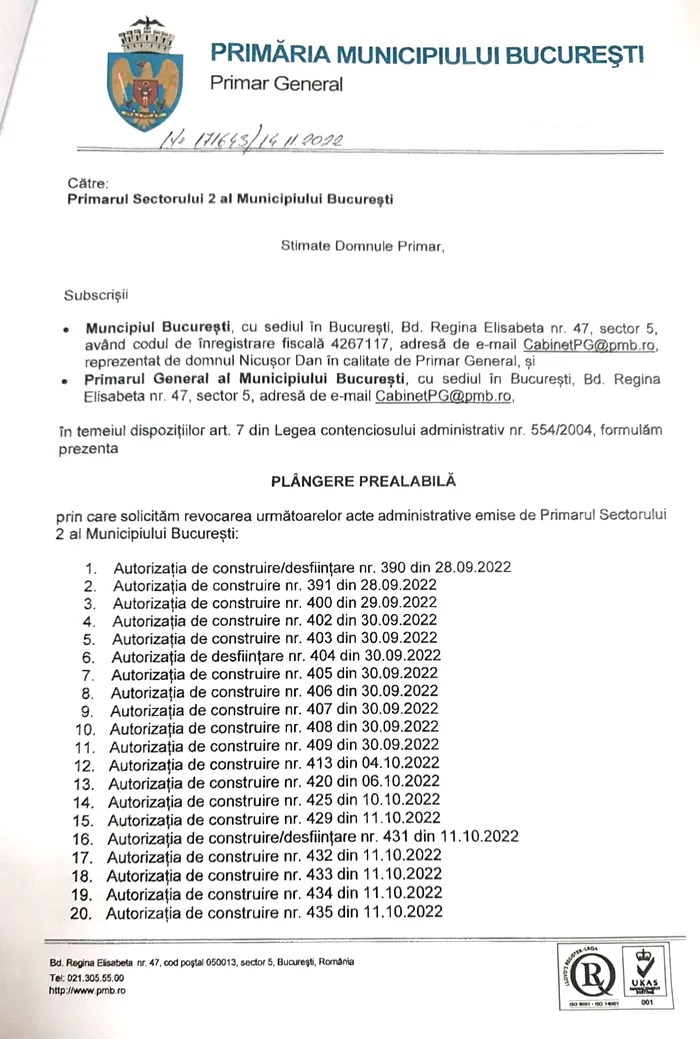 Primarul general Nicușor Dan a făcut o plângere prealabilă către Primăria Sectorului 2, în care îi solicită lui Radu Mihaiu să revoce 38 de acte administrative, respectiv 38 de autorizații de construire. Nicușor Dan invocă suspendarea PUZ-ului de sector, însă, avocații consultați de Gândul spun că Nicușor Dan nu are dreptul să facă astfel de solicitări către o altă autoritate.