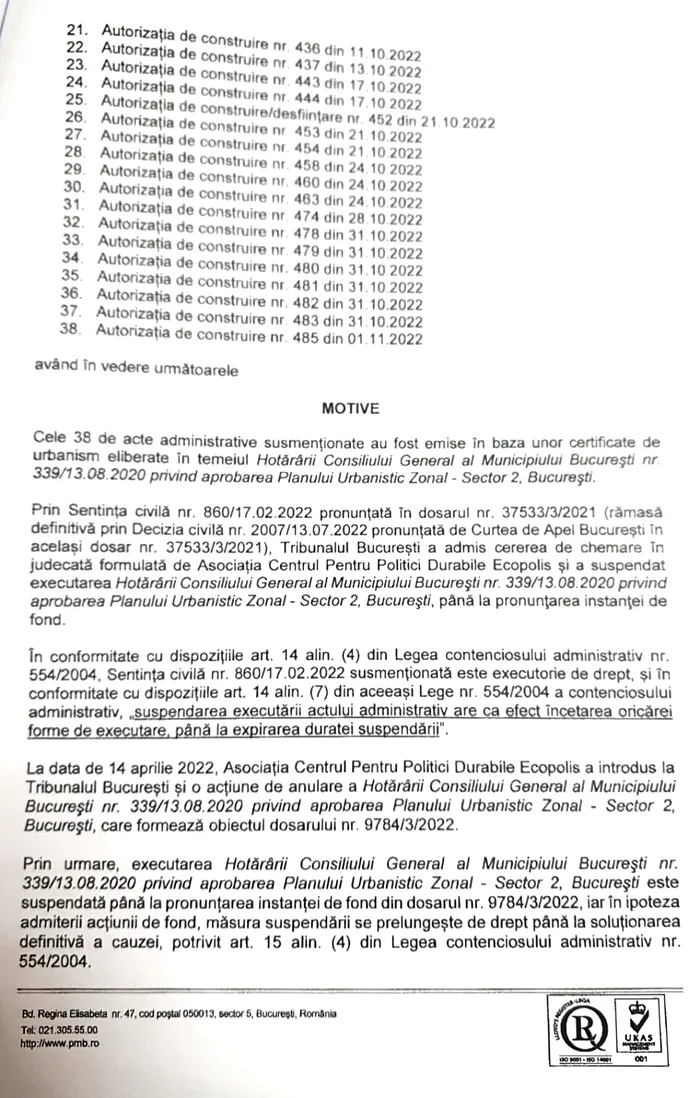 Cu privire la fondul acestei probleme, respectiv autorizațiile date de Primăria Sectorului 2, s-a exprimat toată lumea, s-a exprimat Inspectoratul de Sat în Construcții, s-a exprimat și Prefectura, și Ministerul Justiției, dar și Ministerul Dezvoltării.