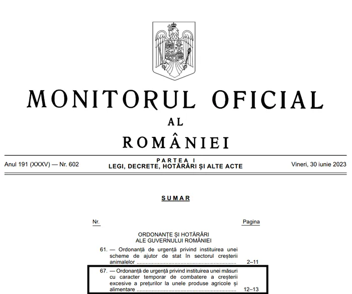 Guvernul a publicat în Monitorul Oficial din 30 iunie 2023 Ordonanța de Urgență pentru plafonarea la 20%, timp de 3 luni, a adaosului comercial la procesatori și la magazine, pentru 14 grupe de alimente de bază, fiind prevăzute anumite termene de intrare în vigoare.
