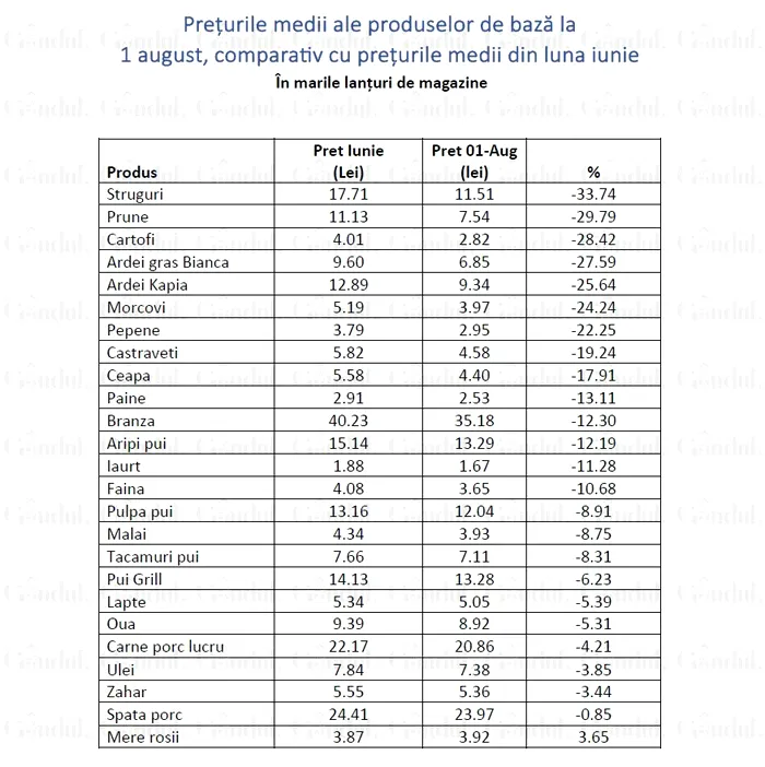 În exclusivitate, Gândul prezintă prețurile medii ale produselor alimentare la 1 august 2023, prin comparație cu prețurile medii ale acelorași produse în luna iunie 2023.