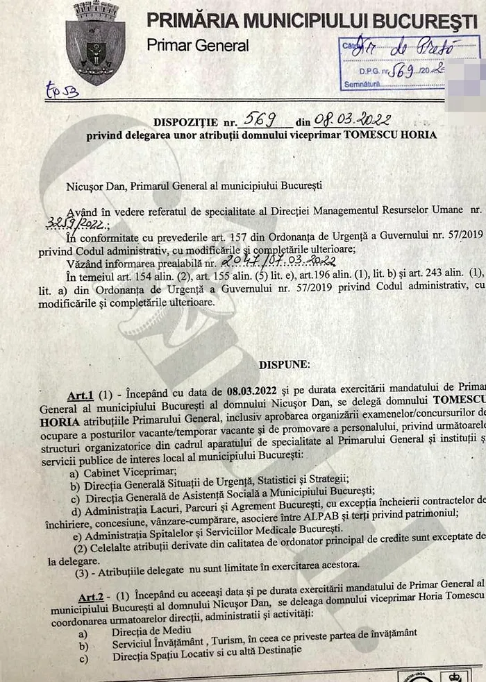 „Începând cu data de 08.03.2022 și pe durata exercitării mandatului primarului general al municipiului București al domnului Nicușor Dan, se delegă domnului Tomescu Horia atribuțiile primarului general, inclusiv aprobarea organizării examenelor/concursurilor de ocupare a posturilor vacante/temporar vacante și de promovare a personalului, privind următoarele instituții și servicii publice de inters local al municipiului București: