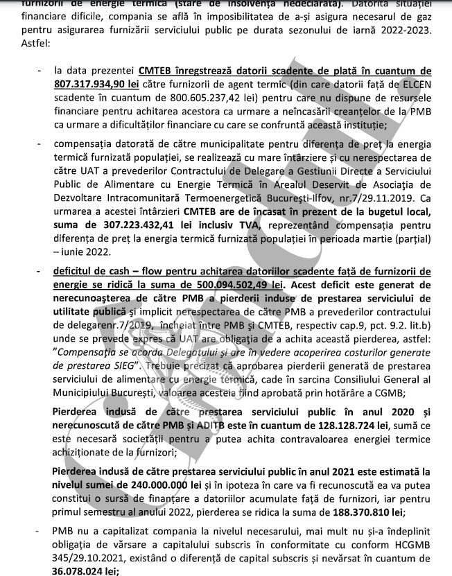 Informațiile, prezentate în exclusivitate de Gândul, sunt de natură să îngrijoreze, iar reprezentanții CMTEB atrag atenția asupra ”riscului de imposibilitate de asigurare a funcționării Sistemului Centralizat de Alimentare cu Energie Termică a Capitalei pe durata sezonului de iarnă 2022-2023 ca urmare a situației financiare dificile în care se află compania”.