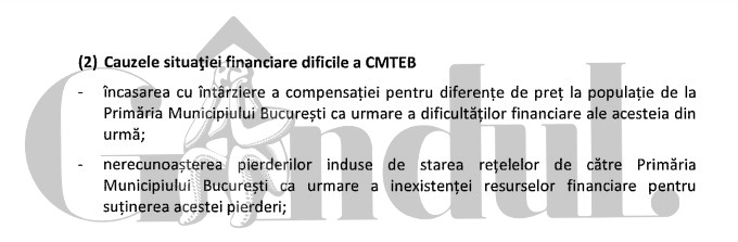 Înainte de orice, ar fi nevoie de ”acțiunea urgentă pentru modificarea cadrului legislativ care să permită ridicarea plafonului de îndatorare a Municipiului București pentru achitarea datoriilor scadente față de CMTEB”.