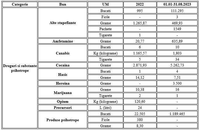 Situaţia existentă la nivelul insituției privind cantitățile de droguri confiscate în anii 2022 și pentru primele opt luni din 2023 arată o creștere pe unele categorii.