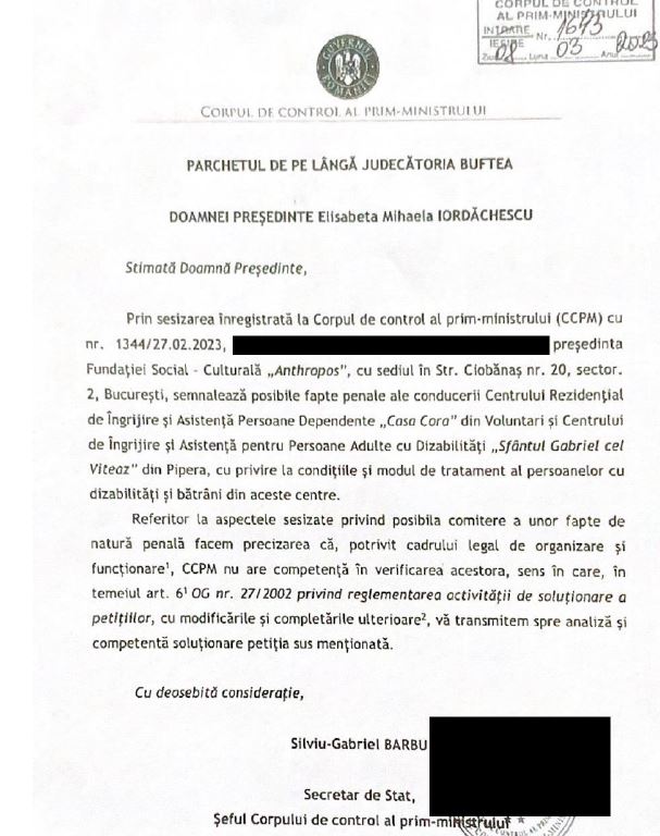 ”Prin sesizarea înregistrată la Corpul de control al prim-ministrului (CCPM) cu nr. 1344/ 27.02.2023, doamna Anca Sorina Popescu – Cruceru, preşedinta Fundaţiei Social – Culturală «Anthropos», (…) semnalează posibile fapte penale ale conducerii Centrului Rezidenţial de Îngrijire şi Asistenţă Persoane Dependente «Casa Cora» din Voluntari şi Centrului de Îngrijire şi Asistenţă pentru Persoane Adulte cu Dizabilităţi «Sfântul Gabriel cel Viteaz» din Pipera, cu privire la condiţiile şi modul de tratament al persoanelor cu dizabilităţi şi bătrâni din aceste centre”, se arată în documentul trimis de şeful Corpului de control al premierului, secretarul de stat Silviu-Gabriel Barbu, către Elisabeta Mihaela Iordăchescu, preşedinta Parchetului de pe lângă Judecătoria Buftea.