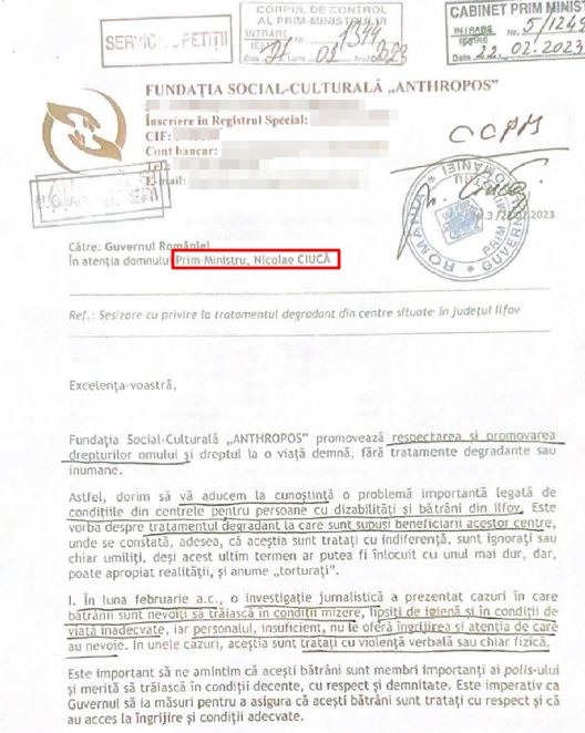 În 22 februarie 2023, premierul de la acel moment, Nicolae Ciucă, a fost sesizat de o organizaţie nonguvernamentală – Fundaţia Social-Culturală ”Anthropos” – în legătură cu situația alarmantă din două centre de îngrijire a bătrânilor și persoanelor cu dizabilități din județul Ilfov, în baza dezvăluirilor făcute de Centrul de Investigații Media și Buletin de București.
