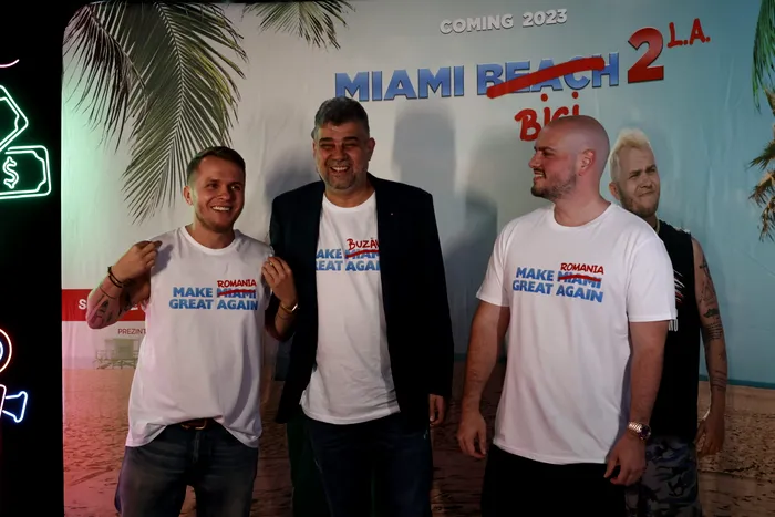 ”Welcome tu Buzău!”, a mai transmis Marcel Ciolacu, îmbrăcat într-un tricou alb, inscripționat cu Make Buzău Great Again (n.red. – ”Să facem Buzăul mare din nou”), orașul Miami fiind tăiat cu o linie roșie.