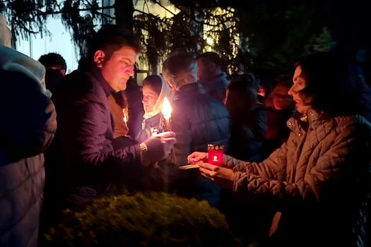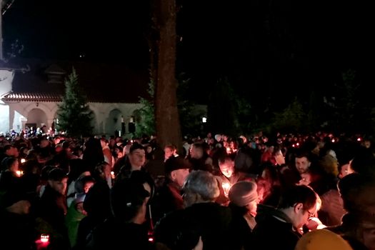Slujba de Înviere a fost săvârșită de preoți și maici la lumina candelelor și luminărilor, pentru că toate luminile din biserică au fost stinse. Ele au fost reaprinse după miezul nopții, odată cu împărțirea Luminii Sfinte.