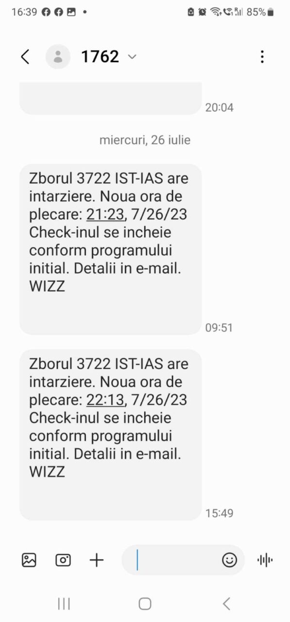„Wizz Air confirmă că zborurile W6 3721 și W6 3722, Iași – Istanbul – Iași, din data de 25 iulie au fost reprogramate pentru data de 26 iulie din cauza indisponibilității sloturilor de decolare, ca urmare a condițiilor meteorologice nefavorabile. Pasagerii au fost informați prin SMS/e-mail. În aceste situații, pasagerii sunt asistați de agenții de handling de la sol. În cazul zborului Istanbul – Iași, celor care au solicitat li s-a asigurat cazare. Wizz Air își cere scuze pasagerilor afectați de situație și reamintește că face toate eforturile posibile pentru a evita perturbările și a reduce întârzierile atunci când acestea sunt inevitabile”, potrivit reprezentanților Wizz Air.
