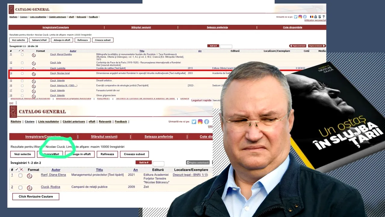 Însă, pe platformă, cartea „Un ostaș în slujba țării” nu există. La o simplă căutare a numelui autorului Ciucă Nicolae, platforma identifică doar teza de doctorat a fostului premier, „Dimensiunea angajării armatei României în operații întrunite multinaționale”, susţinută în anul 2003 la Universitatea Naţională de Apărare „Carol I”.