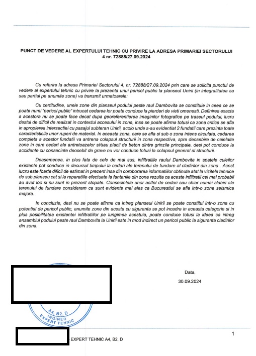 „Cu certitudine, unele zone din planșeul podului peste râul Dâmbovița se constituie în ceea ce se poate numi „pericol public”, întrucât cedarea lor poate conduce la pierderi de vieți omenești”, se arată în documentul transmis de către experți către administrația Sectorului 4, luni, 30 septembrie.