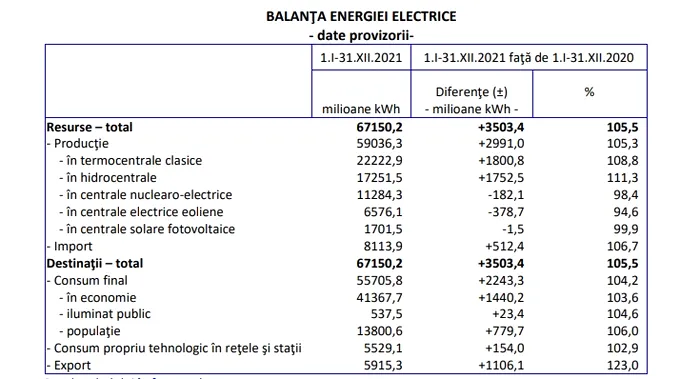 Anul trecut, per ansamblu, incluzând și importurile, resursele de energie electrică au fost de 67.150,2 milioane kWh, în creștere cu 3.503,4 milioane kWh, faţă de 2020. Procentual, înseamnă 5,5%.
