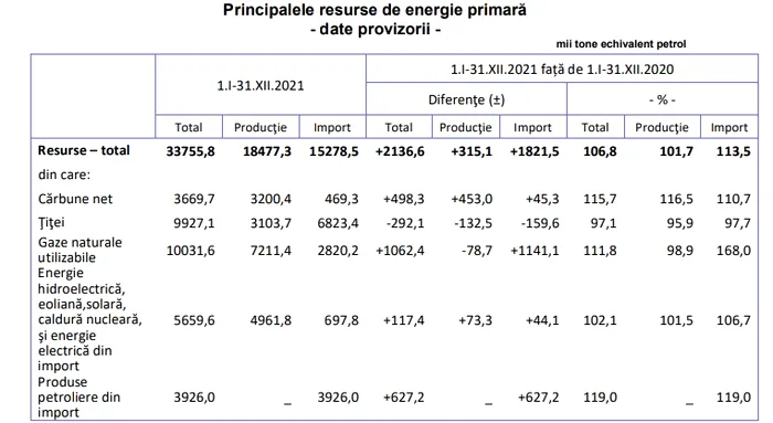 Principalele resurse de energie primară în 2021 au totalizat 33,755 milioane de tone echivalent petrol (tep), în creștere cu 2,136 milioane tep faţă de 2020.