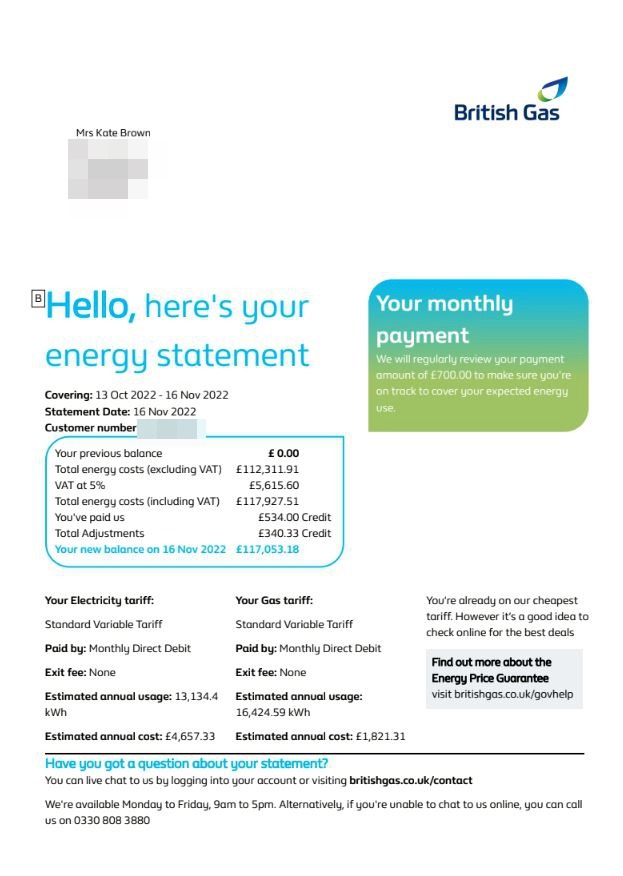 Ea a spus pentru The Sun Online: „Am fost șocată – îmi țineam deja respirația. Am spus că nu este corect. Am sunat la (British Gas) și le-am spus: „Nu cred că sunt 117.000 de lire sterline”, iar ei au spus „oh, nu”. „E ridicol.”