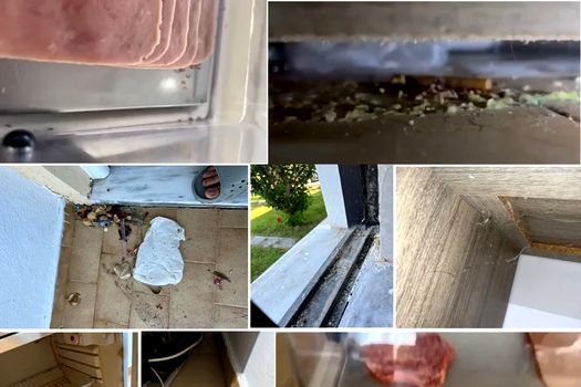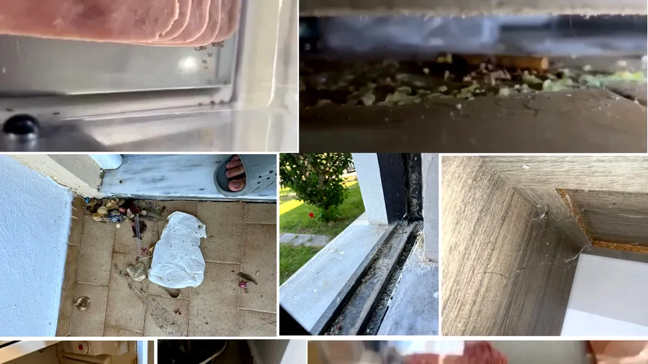 Mușuroaie de furnici, plimbându-se nestingherite printre mâncare, mizerie, electrocasnice ruginite și insalubre, precum și pânze de păianjen.