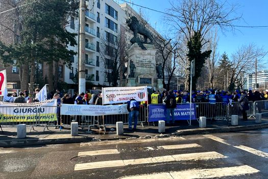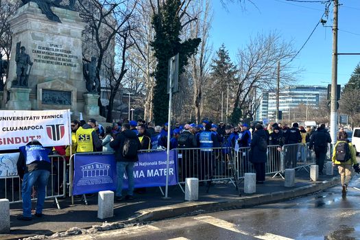 Update 12:10: Sergiu Covaci, reprezentatul studenților prezenți la protest, a transmis: ”Protestăm față de toate măsurile de austeritate care au fost emise anul anterior. Multe dintre ele au afectat și studenții. Vorbim despre transportul acestora, care a fost limitat doar pe ruta centru universitar–domiciliu, despre fondul de burse, care a fost redus cu aproximativ 52%, iar, prin urmare, aproximativ 44 de mii de studenți au rămas fără burse.
