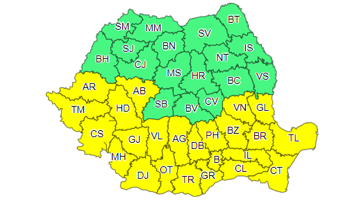 De asemenea, meteorologii au mai emis un cod galben de caniculă în intervalul 13 – 16 iulie care va cuprinde tot sudul României.