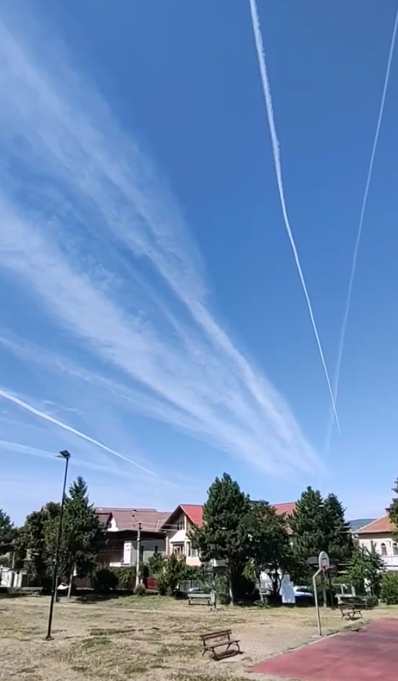 „Aerul curat de deasupra Clujului, Duminică, 25.08.2024, ora 13. Direcția: N-S. Nu sunt avioane de pasageri, cel mai probabil sunt militare. Care este părerea ta? Ce cade pe capul nostru de sus?”, a notat un clujean, pe Facebook.