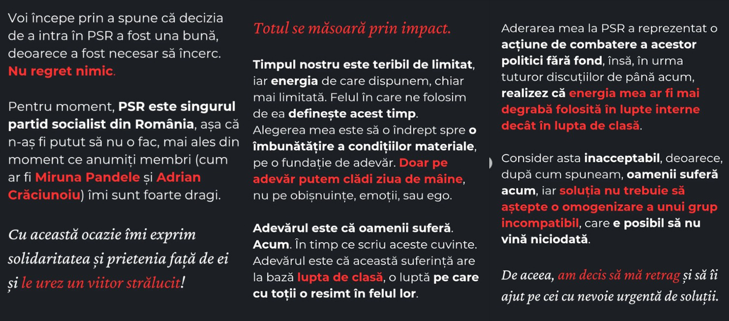 Două luni mai târziu, adică miercuri, a anunțat membri de partid și clasa muncitoare, tot pe X, că renunță la lupta de clasă din România și va urma să se dedice unor cauze și mai nobile.