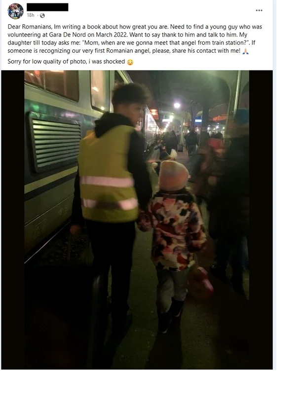 „Dragi români, scriu o carte despre cât de minunați sunteți. Trebuie să găsesc un băiat care a fost voluntar la Gara de Nord în martie 2022. Vreau să îi mulțumesc și să vorbesc cu el. Fiica mea mă întreabă și astăzi când îl vom întâlni din nou pe îngerul din gară. Dacă cineva îl recunoaște pe primul nostru înger român, vă rog să îmi dați contactul lui. Scuze pentru calitatea slabă a pozei, dar eram șocată”, a scris femeia pe grupul „Uniți pentru Ucraina”.