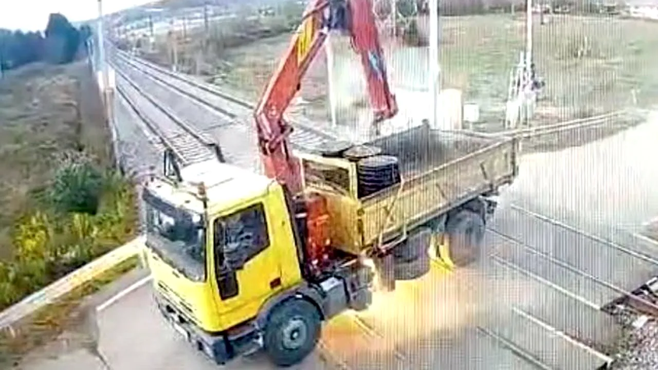 Momentul a fost surprins de o cameră de supraveghere, iar în imagini se poate observa cum camionul trece calea ferată cu dublu sens, barierele fiind ridicate. Doar că, pentru că și brațul de macara era la fel, în urma trecerii, firele de contact de pe ambele sensuri au fost rupte.