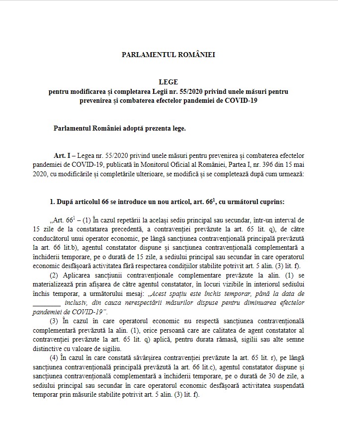Noul proiect de lege prevede ca firmele care sunt descoperite că încalcă repetat măsurile anti-COVID într-un interval de 15 zile dintre constatări vor fi închise temporar, timp de 15 zile (sediul principal sau secundar în care operatorul economic desfășoară activitatea).