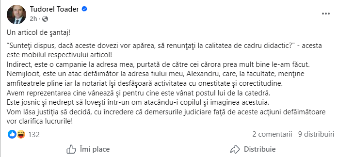 «Sunteţi dispus, dacă aceste dovezi vor apărea, să renunţaţi la calitatea de cadru didactic», este mesajul respectivului articol! Indirect, este o campanie la adresa mea, purtată de către cei cărora prea mult bine le-am făcut. Nemijlocit, este un atac defăimător la adresa fiului meu, Alexandru, care, la facultate, menţine amfiteatrele pline, iar la notariat îşi desfăşoară activitatea cu onestitate şi corectitudine. Avem reprezentarea cine vânează şi pentru cine este vânat postul lui de la catedră. Este josnic şi nedrept să loveşti într-un om atacându-i copilul şi imaginea acestuia”, a scris Tudorel Toader, pe FB.