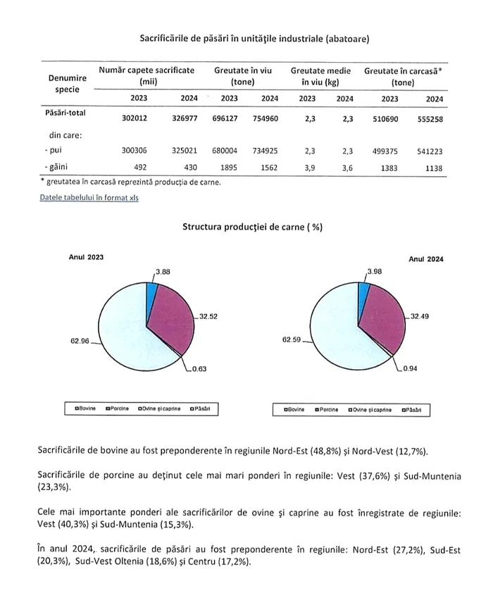 „Datele INS arată că producția de carne de ovine și caprine a crescut cu 62.1%, de bovine cu 12,2%, de porcine cu 9,2%, iar de pasăre cu 8.7%, față de anul 2023.
