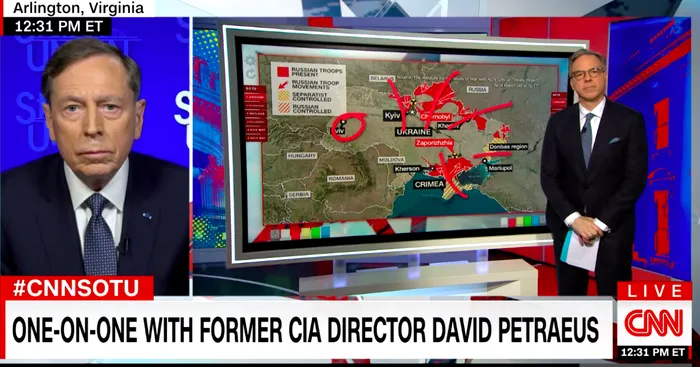 Întrebat care este cea mai mare îngrijorare a sa din punct de vedere strategic în războiul din Ucraina, Patraeus a răspuns: „înconjurarea Kievului”. „Însă, țineți minte că orașul Kiev este întins pe o suprafață mai mare decât orașul New York. Ucrainenii au aruncat în aer mai multe poduri ca să prevină încercuirea orașului. Repet, este un mix foarte impresionant de forțe convenționale, brigăzi civile partizane și rezistența, care fac lucrurile foarte dificile pentru ruși. Oamenii au dat jos indicatoarele de drum sau au scris pe ele „bine ați venit în iad”.
