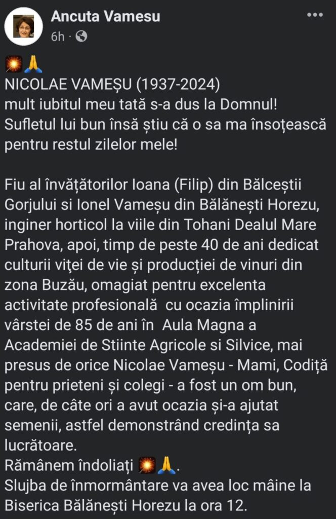 Nicolae Vameșu, fostul director al Vinalcool Buzău a murit, miercuri, la vârsta de 87 de ani. Pe vremea lui Nicolae Ceaușescu, el era unul din cei mai importanți oameni din județ.