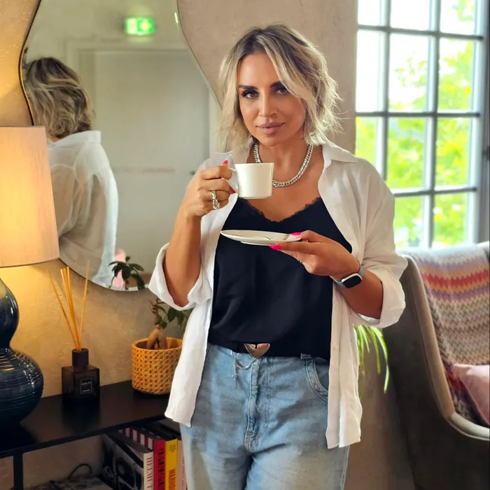 Nu beau lapte, extrem de rar se întâmplă. Am grijă să am multe fibre, am grijă la hidratare și nu dorm sub șapte ore pe noapte. Dimineața mă trezesc, plimb cățelul, îmi fac pașii. Cam 10 000 de pași fac pe zi”.
