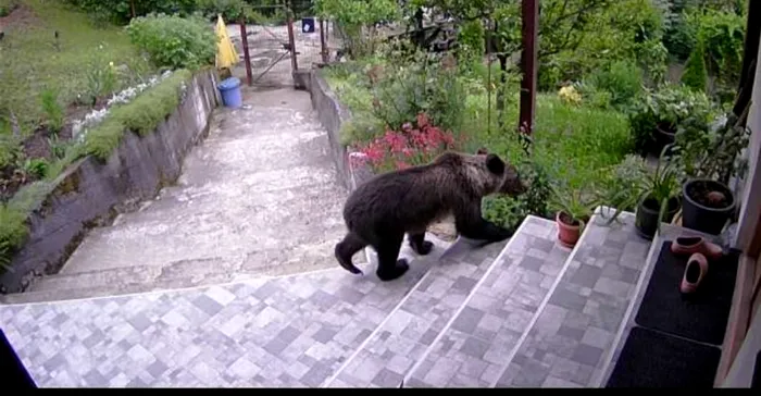 Imagini fabuloase cu un urs care vrea să intre într-o casă au fost surprinse în aceste zile în orașul Săcele, din Brașov.
