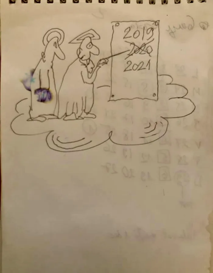 Desenul, făcut public de către fiica jurnalistului, reprezintă doi îngeri care „taie” din calendar anul 2020 – anul pandemiei, și a fost realizat în ultimele zile de viață ale omului de presă.