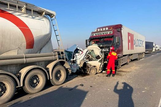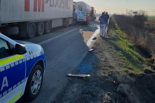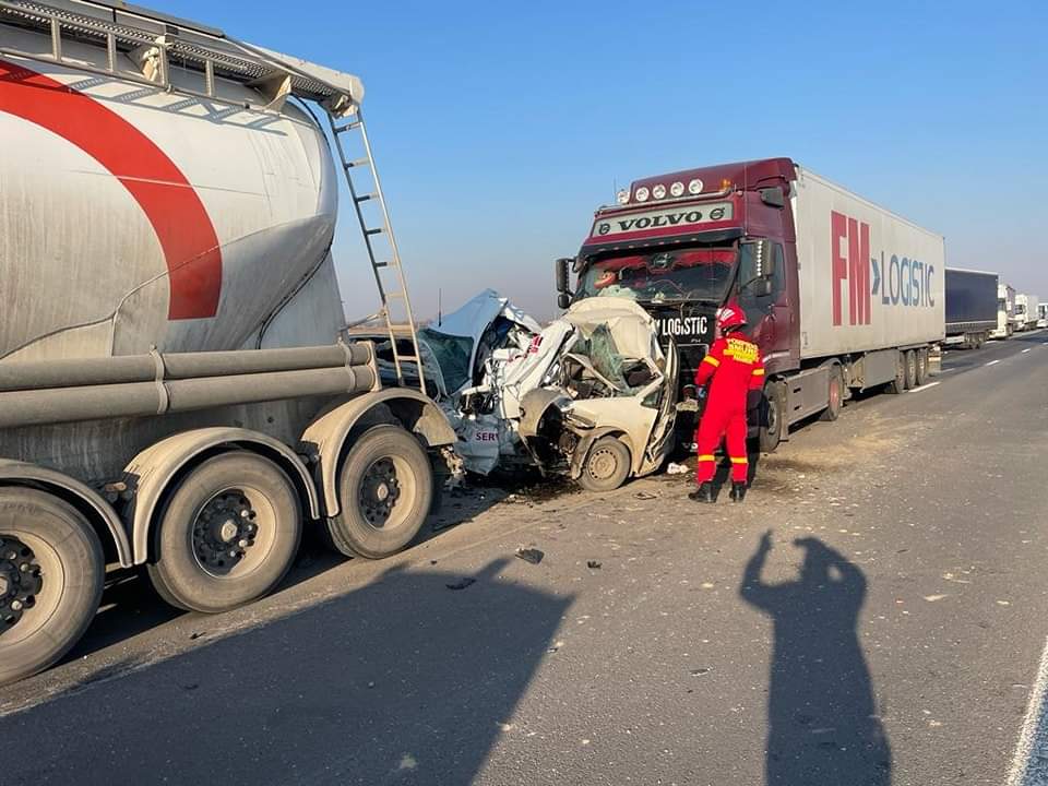 O mașină a fost prinsă între un tir și o cisternă. Un al patrulea autovehicul a fost implicat în accident.