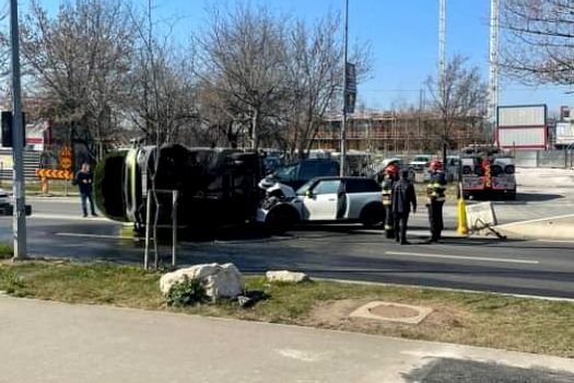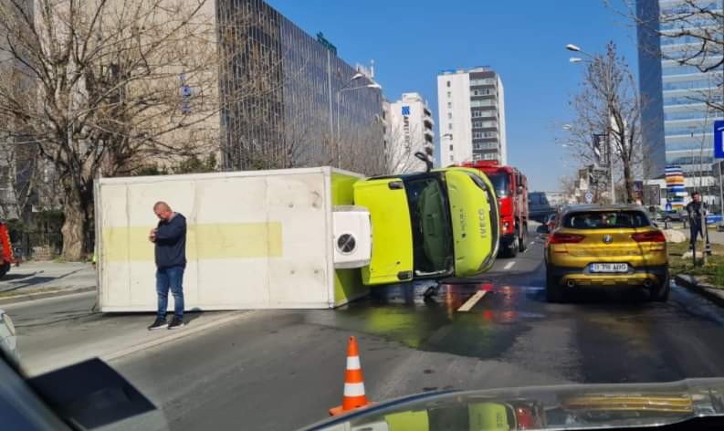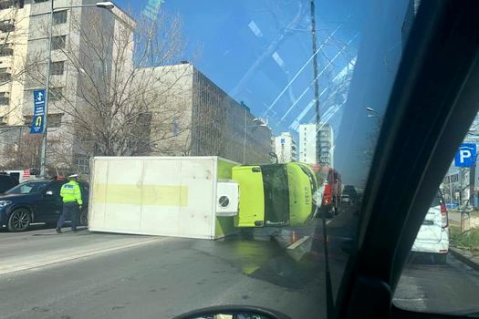 Un camion s-a răsturnat iar în cădere a lovit și o mașină marca Audi, care se afla în mers, au precizat oficialii Brigăzii Rutiere a Capitalei, pentru GÂNDUL.