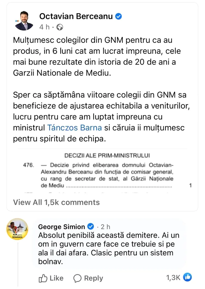 Interesant în acest context este și faptul că scandările ”M…e USR” au survenit pe fondul unei declarații cel puțin interesante a lui George Simion, declarație postată pe pagina fostului șef al Gărzii de Mediu. Acesta se ”gudura”, practic, pe lângă Octavian Berceanu (USR PLUS), cel care a devenit șeful Gărzii de Mediu, numai că a fost demis de premierul Florin Cîțu.