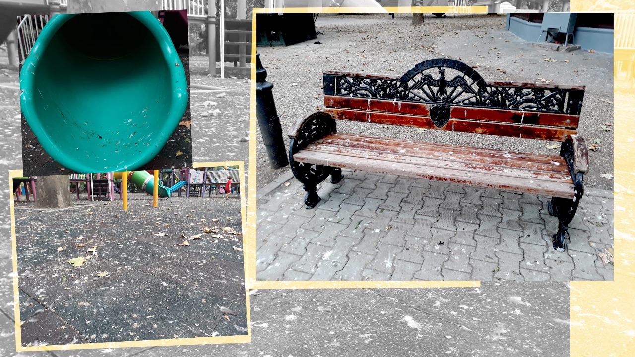 La locul de joacă pentru copii (central) este plin de excremente de păsări. Mizeria se găsește peste tot, de la tartan, până la tobogane, dar și pe băncile pe care părinții ar trebui să se relaxeze…