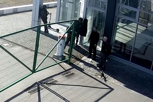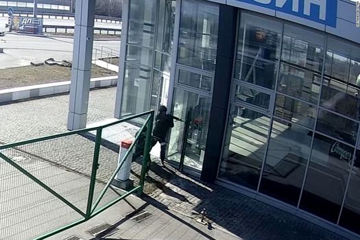 Conform imaginilor, cinci soldați ruși ajung la reprezentanța auto și încearcă să intre în sediu, trăgând în lacăte și spărgând sticla.