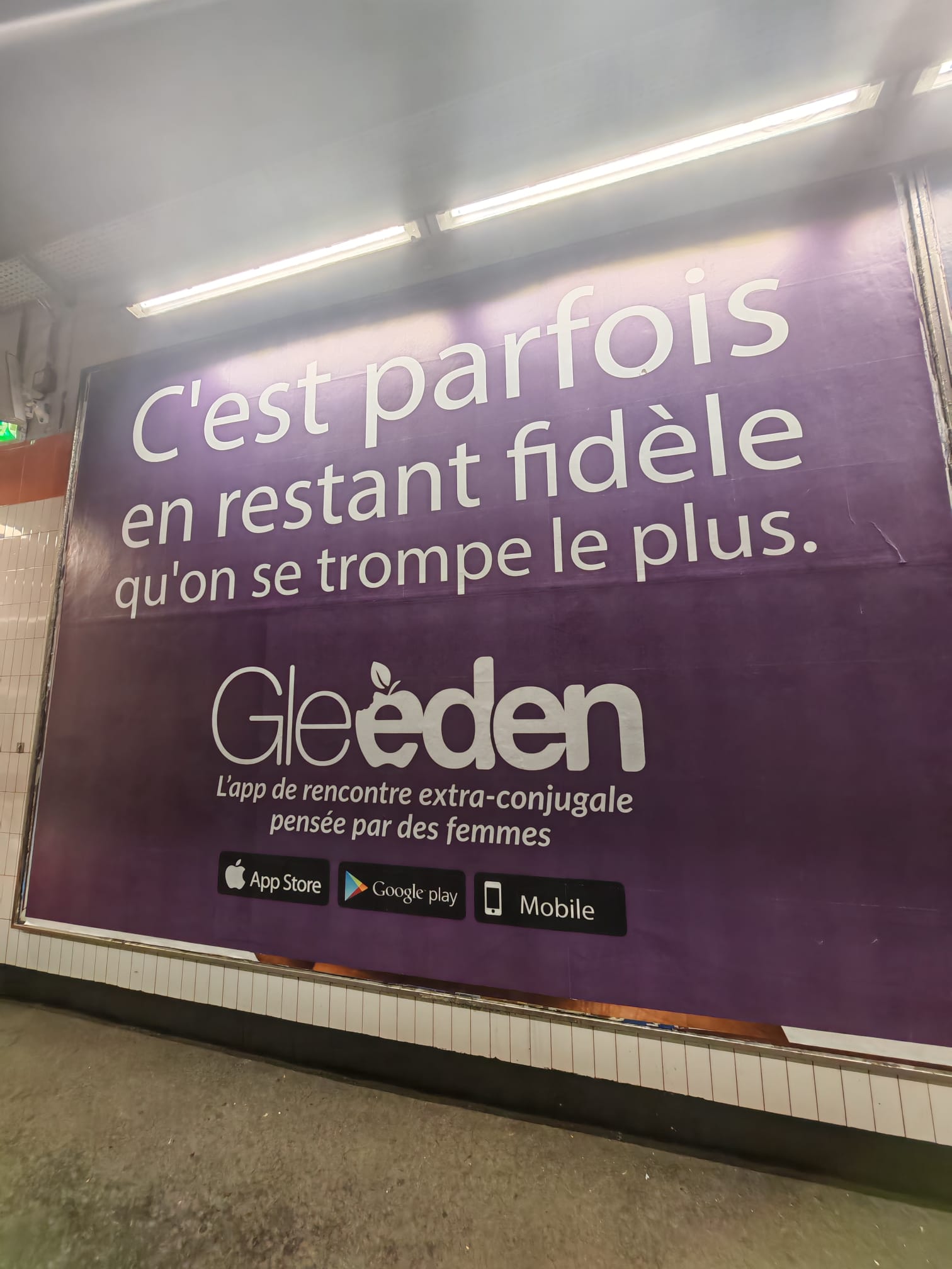 „Uneori, rămânând fideli, greşim cel mai mult” s-ar traduce mesajul pe care siteul de dating destinat celor căsătoriţi îl afişează la vedere, pe zdurile din staţiile de metrou pariziene.