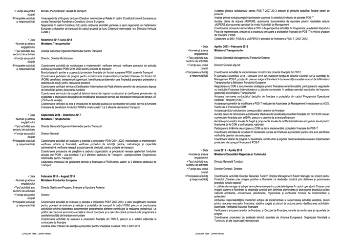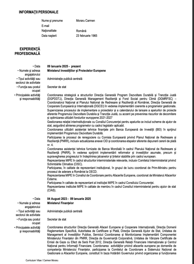 Potrivit CV-ului acesteia, Carmen Moraru a lucrat toată viaţa la stat.