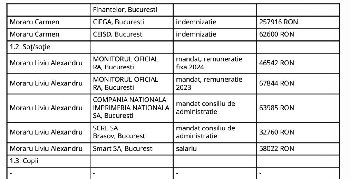Se adaugă salariul de 46.542 lei încasat de soțul ei, Liviu Alexandru Moraru, de la Monitorul Oficial RA.
