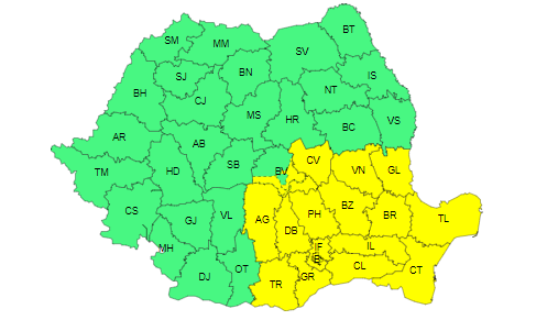 Administraţia Naţională de Meteorologie a emis, miercuri, o atenţionare de tip cod galben de instabilitate atmosferică temporar accentuată, care vizează zone din Muntenia, Dobrogea, sudul Moldovei şi sud-estul Transilvaniei.