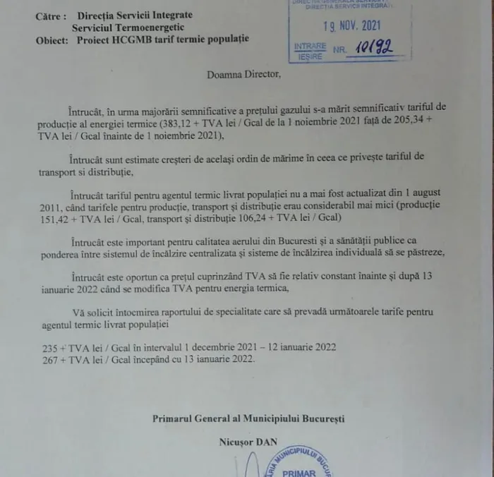 „În următoarea ședință de Consiliu General, programată pe 26 noiembrie, Nicușor Dan va cere consilierilor să voteze majorarea tarifului plătit de populație până la 280 lei/Gcal!
