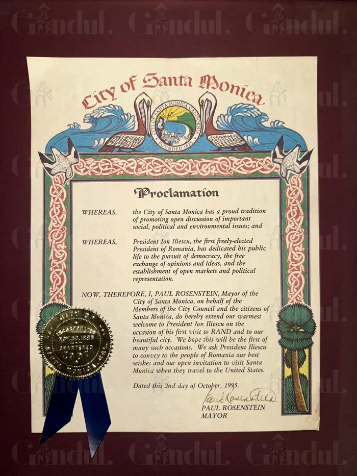 Arhiva personală a familiei Iliescu. Proclamația orașului Santa Monica în onoarea lui Ion Iliescu.
